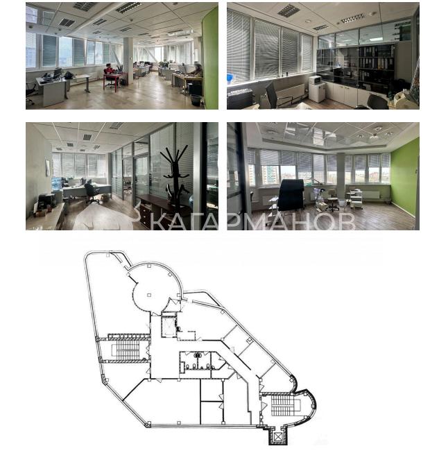 Этаж поделён на 11 кабинетов от 9 до 65 кв.м., есть зона ресепшн, подсобные